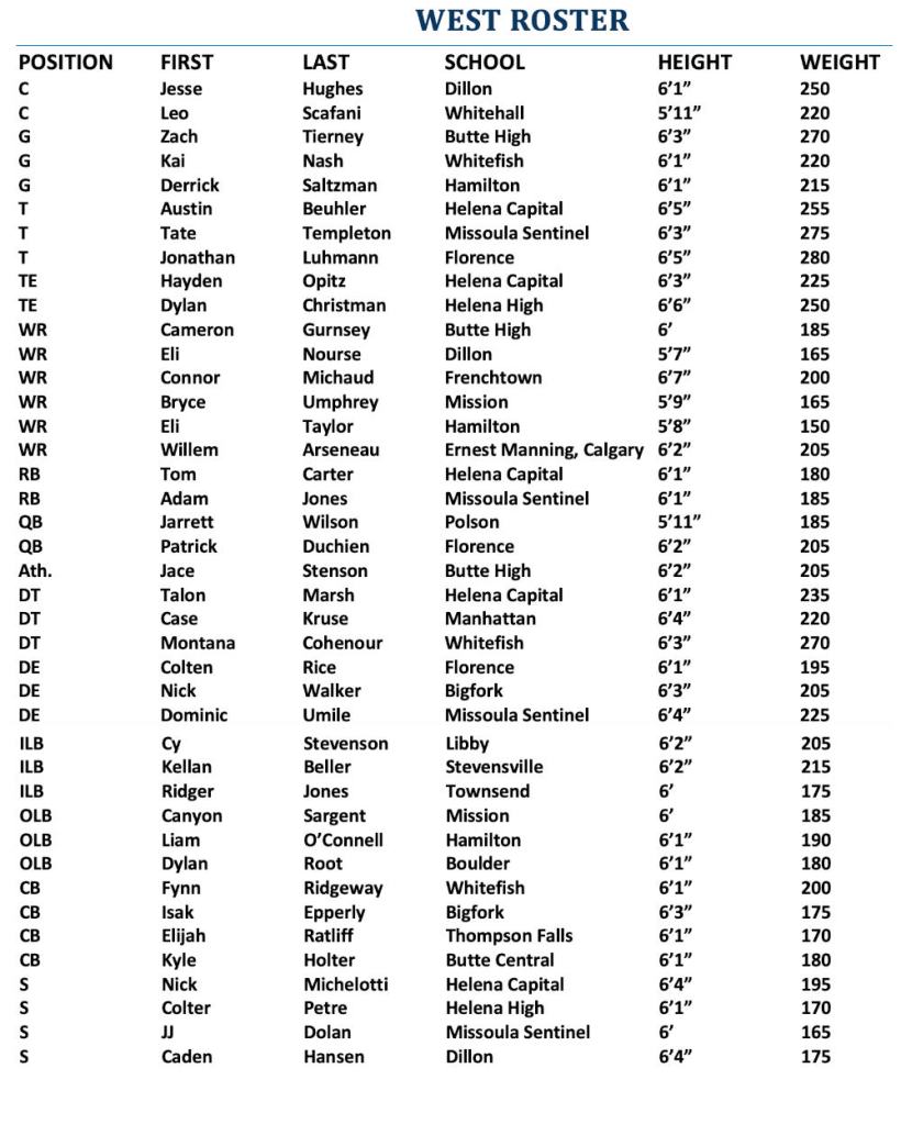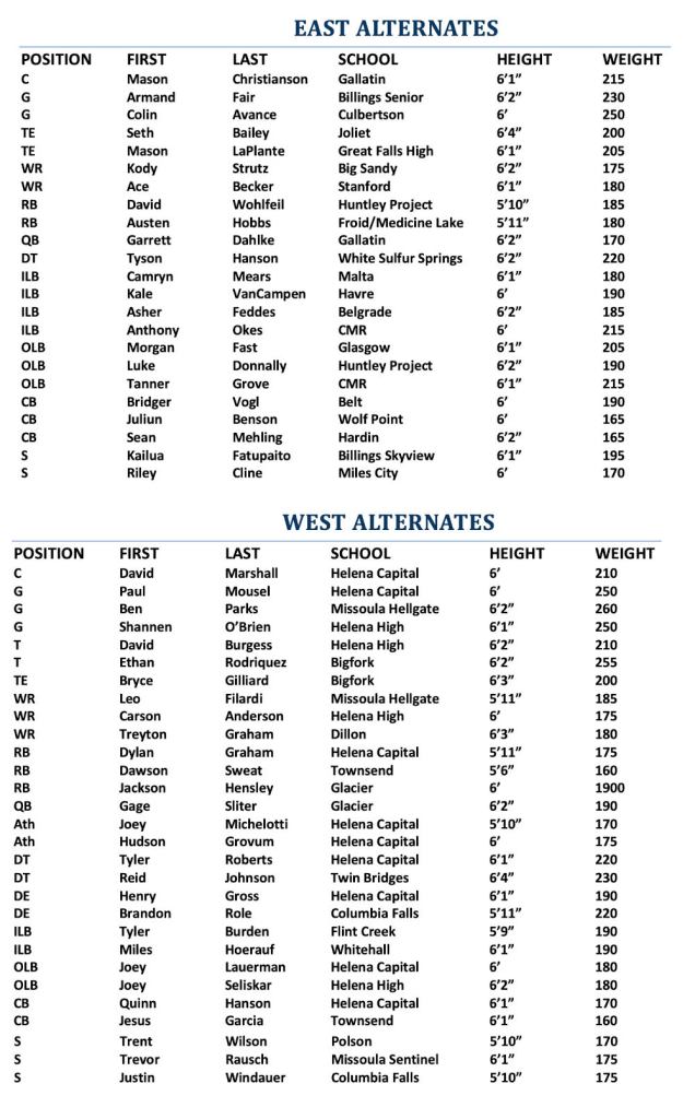 Note: Tyler Kovick of Helena Capital was also named an alternate at defensive back for the West Side. His name was inadvertently omitted from a list sent out by the Shriners.