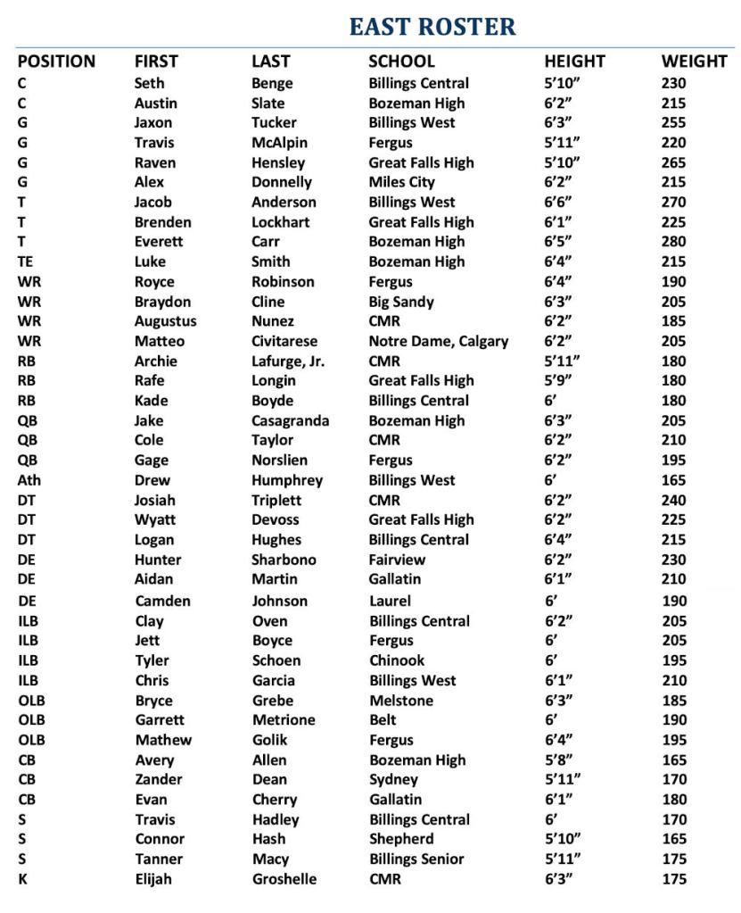 The rosters for the 76th Montana East-West Shrine Game were released on Christmas morning, and three Butte High Bulldogs and one Butte Central Maroon got the call.