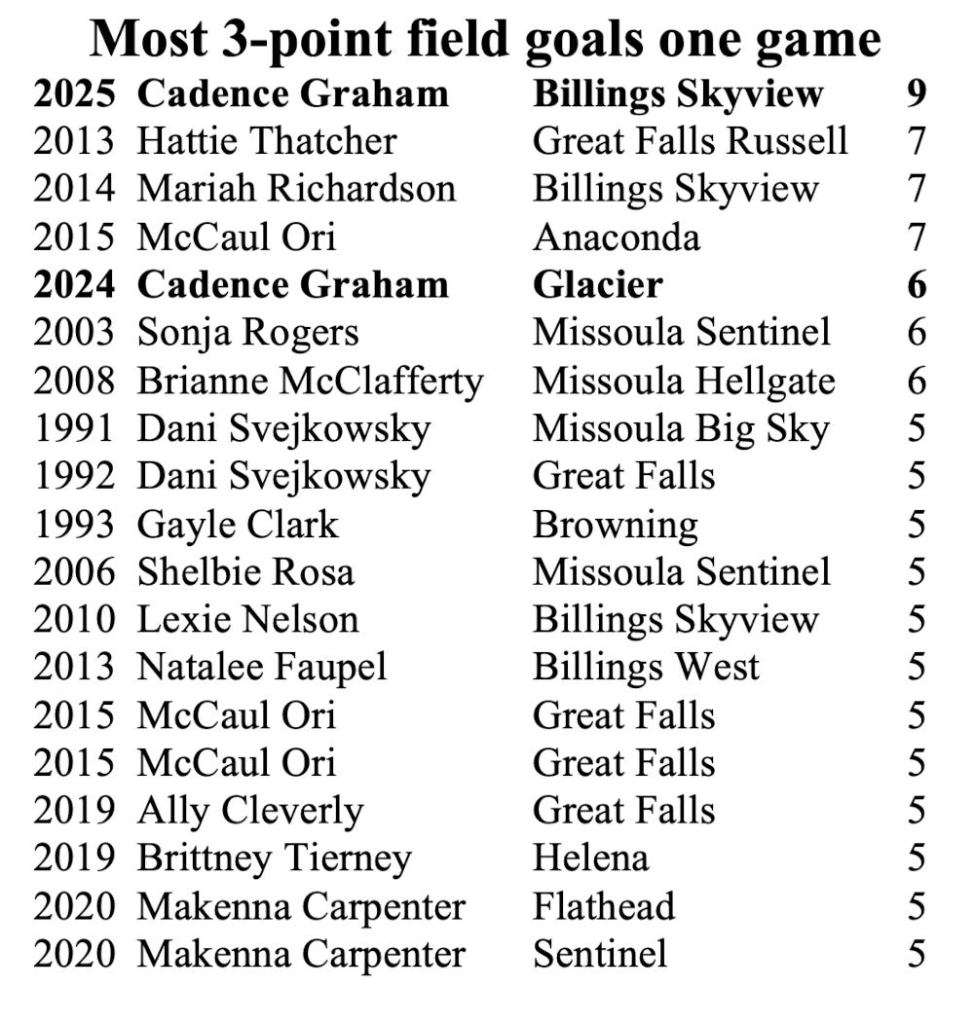 Graham broke Butte High’s school record by hitting nine 3-pointers in that win. She did not play in the fourth quarter.