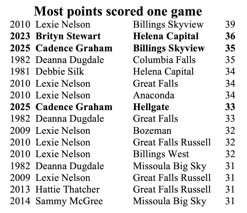 Cadence Graham, by the way, tied Dugdale with 35 points in Saturday morning’s loser-out win over Billings Skyview at the Class AA State tournament in Bozeman.