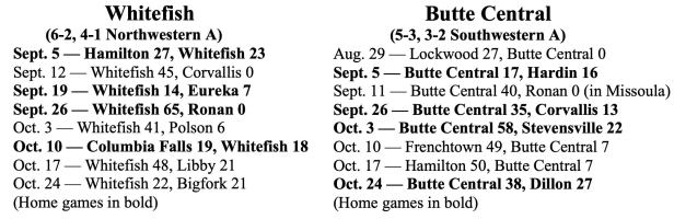 Central plays at Whitefish in the Class AA playoffs (bracket), while Butte High will head to the Electric City to take on Great Falls Russell in the Class AA playoffs (bracket). Both games kickoff at 7 p.m.
