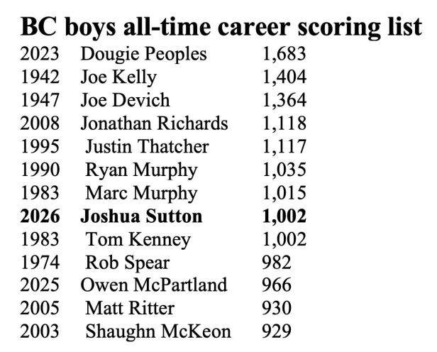 With an inside hoop in the fourth quarter, Sutton became the ninth BC boy to score 1,000 points for his career. He is tied with Maroon great Tom Kenney for eighth place on BC’s all-time scoring list with 1,002 points. He is just behind Marc Murphy (1,015) and the late Ryan Murphy (1,035).